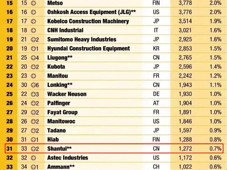 近日,由英国KHL集团发布的2019年全球工程机械制造商50强排行榜(Table 2019)出炉,山推股份公司排名稳步提升至31位,较前年相比提升7位,成为国内上榜企业中排名上升幅度较大的企业 星辰影院,实现了在全球激烈竞争环境下的稳步提升,。