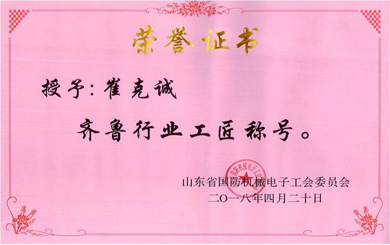 4月20日,在山东省国防机械电子工会组织举办的“为创新驱动耕耘,为工匠精神点赞”演讲报告会上,崔克诚被命名为“齐鲁行业工匠” 星辰影院,被授牌命名为“崔克诚工匠创新工作室”,是继孙佑军,向俊兵之后,公司第三位山东省行业大工匠,同时,公司工会被授牌命名为“工匠文化品牌创建示范单位”。