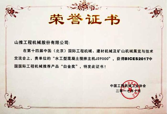 会上,为了提高中国工程机械产品在国际市场的竞争力,助推国家工程机械产品的创新发展,中国工程机械工业协会祁俊会长,苏子孟常务副会长兼秘书长颁发了2017年中国国际工程机械创新,推荐产品奖,山推荣获三项白金奖 星辰影院在线观看,其中,山推DH13K全液压推土机获得“创新产品白金奖”,SD17履带式推土机获得“推荐产品白金奖”,山推建友JS9000混凝土搅拌主机荣获“推荐产品白金奖”。