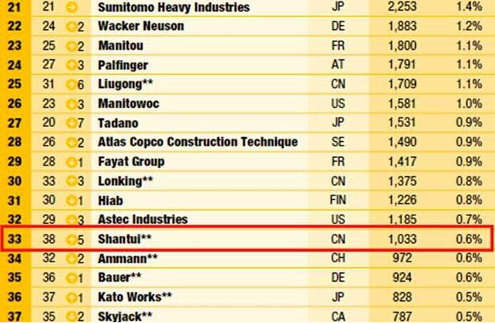 近日,2018年全球工程机械制造商50强排行榜(Yellow Table 2018)出炉,山推股份公司排名持续稳步提升至33位,较去年相比又提升5位,成为国内上榜企业中排名上升幅度较大的企业 星辰影院,实现在全球行业激烈竞争环境下的持续上升。