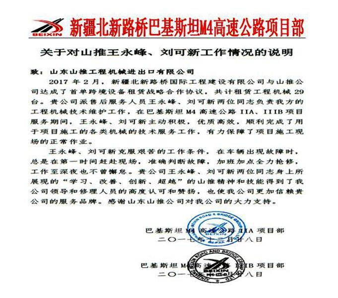 2018年伊始,公司收到山推巴基斯坦供方平台项目最终用户-新疆北新路桥巴基斯坦M4高速公路项目部的一封感谢信,项目部对公司员工王永峰和刘可新在该项目中主动积极,优质高效 星辰影院,尽职尽责的工作,表示高度的认可和赞扬。