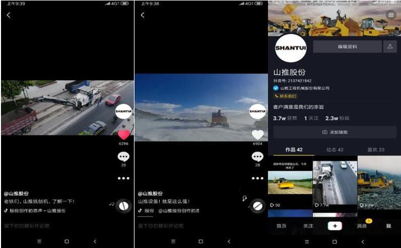 自3月以来,市场部面向全体员工,全国代理商收集抖音视频素材,并运用先进的技术手段进行整理,剪辑,整合,发布,其中包括“老铁们,山推铣刨机,了解一下”“山推设备,就是这么强”“山推关爱行十周年,高低快全服务升级”“山推无人驾驶压路机”等一系列精彩视频,围绕着“高低快全爽”增强客户的体验感 星辰影视资源,吸引了更多的客户关注山推产品,提高山推品牌的美誉度。