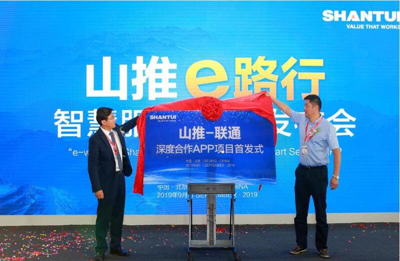 9月4日上午 星辰影院在线观看,山推展台,山推股份公司总经理张民,中国联通山东省分公司战略客户中心总经理姚路平,共同为山推e路行APP揭牌。