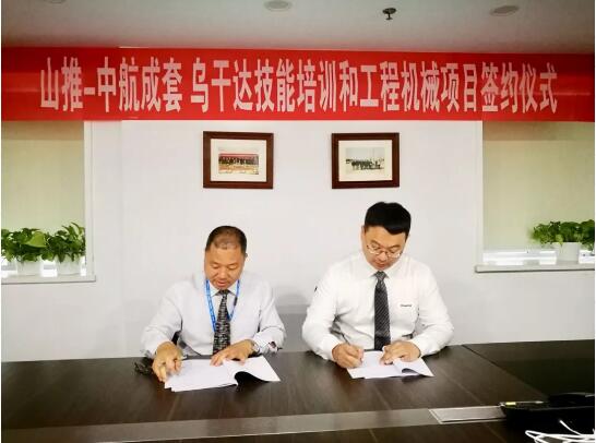 10月24日上午 星辰影院,山推-中航成套乌干达技能培训和工程机械项目签约仪式在北京召开,进出口公司负责人代表山推与中航成套签订了合作协议。