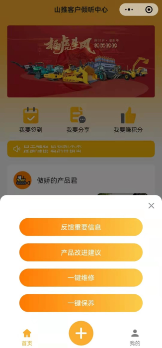 各位老铁,山推客户倾听中心小程序正式上线啦!山推客户倾听中心旨在倾听市场一线信息的反馈,更好、更快地解决客户诉求、塑造客户价值。