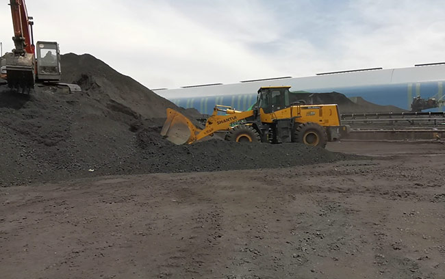 江苏某港口煤炭铲装作业,专用煤斗容量大,工作效率高,发动机和传动系统提供强劲动力